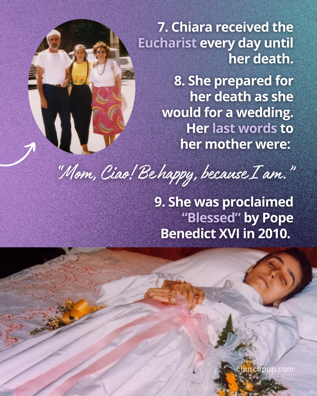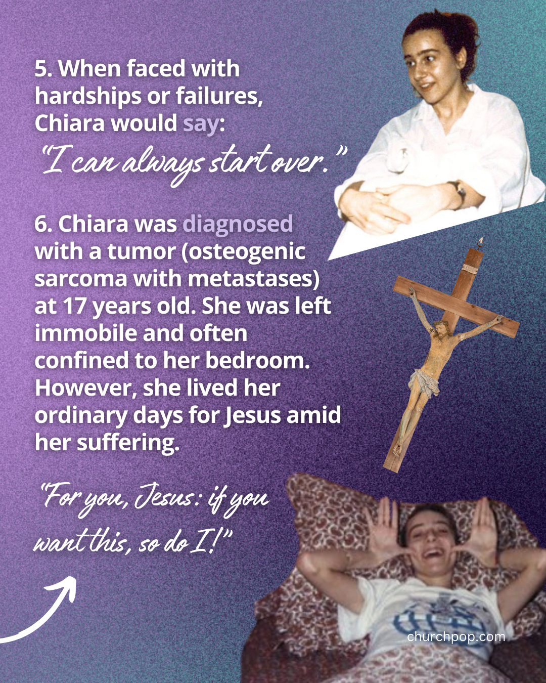 6. Chiara was diagnosed with a tumor (osteogenic sarcoma with metastases) at 17 years old. She was left immobile and often confined to her bedroom. However, she lived her ordinary days for Jesus amid her suffering.