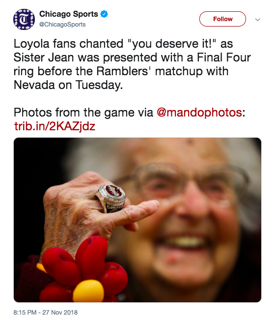 According to the Chicago Sports Twitter account, the audience chanted, “you deserve it!” while Sr. Jean received the ring.