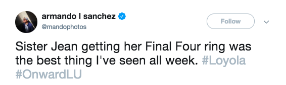 Armando Sanchez, who posted the above photos, said in his tweet, “Sister Jean getting her Final Four ring was the best thing I’ve seen all week. #Loyola #OnwardLU”