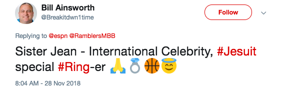 In response to a video posted on ESPN’s twitter, this user said, “Sister Jean – International Celebrity, #Jesuit special #Ring-er 🙏💍🏀😇.”