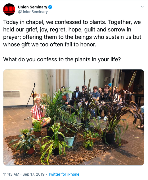 The full post reads, “Today in chapel, we confessed to plants. Together, we held our grief, joy, regret, hope, guilt and sorrow in prayer; offering them to the beings who sustain us but whose gift we too often fail to honor.