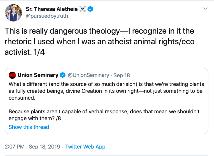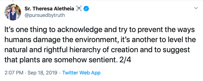 Sr. Aletheia continues, “It’s one thing to acknowledge and try to prevent the ways humans damage the environment, it’s another to level the natural and rightful hierarchy of creation and to suggest that plants are somehow sentient.”