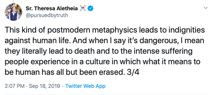 She adds, “This kind of postmodern metaphysics leads to indignities against human life. And when I say it’s dangerous, I mean they literally lead to death and to the intense suffering people experience in a culture in which what it means to be human has all but been erased.”