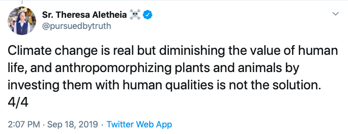 Sr. Aletheia concludes, “Climate change is real, but diminishing the value of human life, and anthropomorphizing plants and animals by investing them with human qualities, is not the solution.”