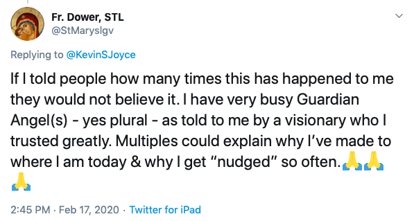 Father Dower of Longview, Texas said, "If I told people how many times this has happened to me, they would not believe it. I have very busy Guardian Angel(s) - yes plural - as told to me by a visionary who I trusted greatly. Multiples could explain why I’ve made to where I am today [and] why I get 'nudged' so often."