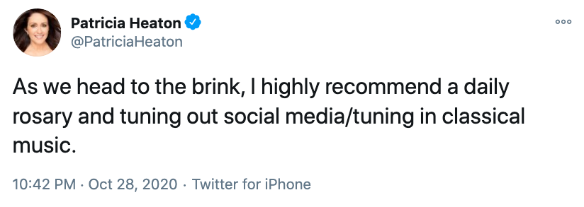 Heaton’s full tweet reads, “As we head to the brink, I highly recommend a daily rosary and tuning out social media/tuning [into] classical music.”