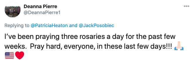 This user wrote, I’ve been praying three rosaries a day for the past few weeks. Pray hard, everyone, in these last few days!!! 🙏 🇺🇸 ❤️”
