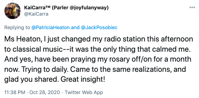 This user added, “Ms. Heaton, I just changed my radio station this afternoon to classical music–it was the only thing that calmed me. And yes, have been praying my rosary off/on for a month now. Trying to daily. Came to the same realizations, and glad you shared. Great insight!”