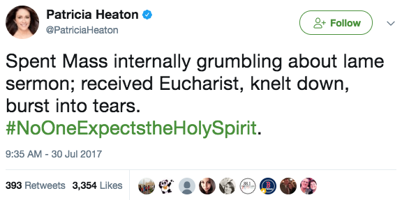 Her tweet reads: “Spent Mass internally grumbling about lame sermon; received Eucharist, knelt down, burst into tears. #NoOneExpectstheHolySpirit.”