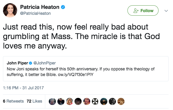 The tweet reads: “Just read this, now feel really bad about grumbling at Mass. The miracle is that God loves me anyway.” It was in response to an article shared by Protestant pastor John Piper.