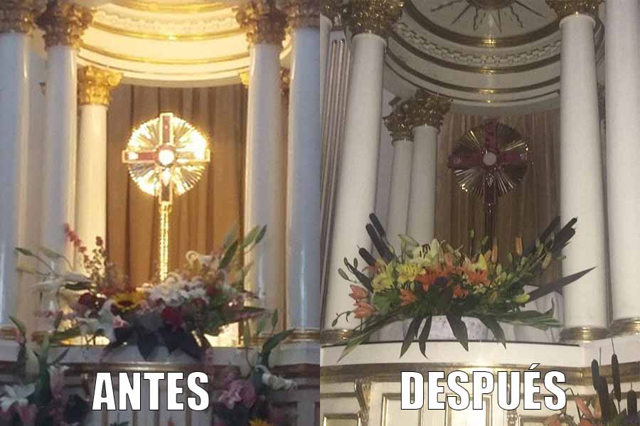 It’s impossible to know for certain what these people saw. But if the supposed miracle is simply that the monstrance turned red, there wouldn’t seem to be any miracle in that, since the monstrance was already red. We tracked down a picture of the monstrance before the earthquake, and here’s a comparison: