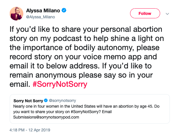 Milano’s tweet reads, “If you’d like to share your personal abortion story on my podcast to help shine a light on the importance of bodily autonomy, please record story on your voice memo app and email it to below address. If you’d like to remain anonymous please say so in your email. #SorryNotSorry”