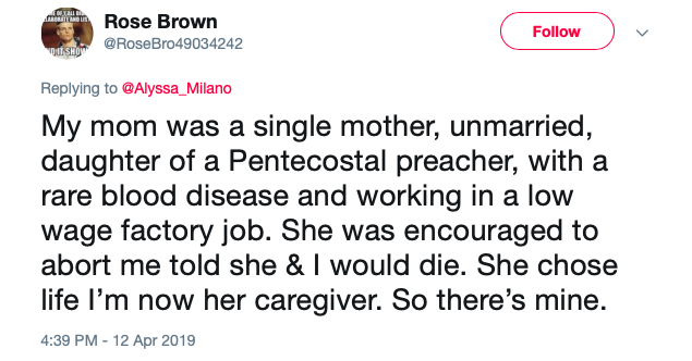 This user’s tweet reads, “My mom was a single mother, unmarried, daughter of a Pentecostal preacher, with a rare blood disease and working in a low wage factory job. She was encouraged to abort me told she & I would die. She chose life I’m now her caregiver. So there’s mine.”