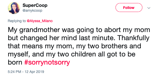 This user said, “My grandmother was going to abort my mom but changed her mind last minute. Thankfully that means my mom, my two brothers and myself, and my two children all got to be born #sorrynotsorry”