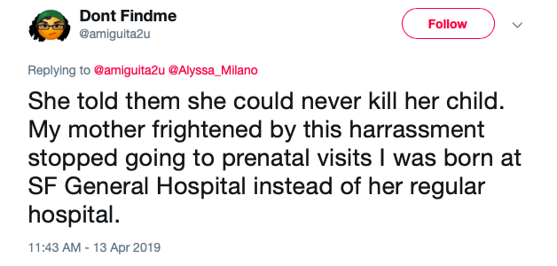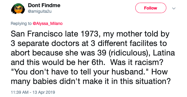 Her tweets read, “In late 1973 in San Francisco, my mother was told by 3 separate doctors at 3 different facilites to abort because she was 39 (ridiculous), Latina, and this would be her 6th. Was it racism? ‘You don’t have to tell your husband.’ How many babies didn’t make it in this situation?”