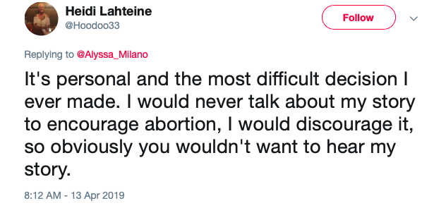 This user tweeted, “It’s personal and the most difficult decision I ever made. I would never talk about my story to encourage abortion, I would discourage it, so obviously you wouldn’t want to hear my story.”