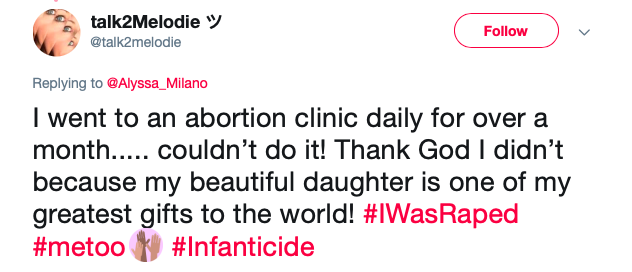 Another mother tweeted, “I went to an abortion clinic daily for over a month….. couldn’t do it! Thank God I didn’t because my beautiful daughter is one of my greatest gifts to the world! #IWasRaped #metoo #Infanticide