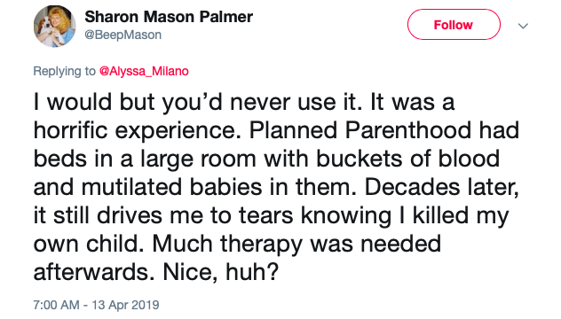 Another abortion sufferer tweeted, “I would but you’d never use it. It was a horrific experience. Planned Parenthood had beds in a large room with buckets of blood and mutilated babies in them. Decades later, it still drives me to tears knowing I killed my own child. Much therapy was needed afterwards. Nice, huh?