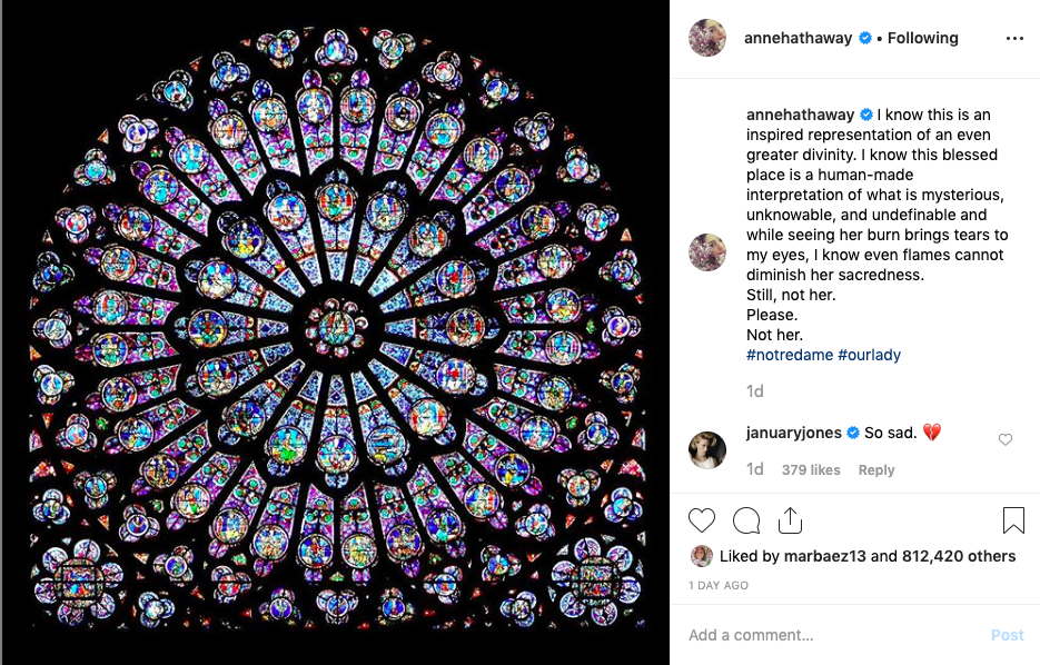 Anne Hathaway’s Instagram post reads, “I know this is an inspired representation of an even greater divinity. I know this blessed place is a human-made interpretation of what is mysterious, unknowable, and undefinable and while seeing her burn brings tears to my eyes, I know even flames cannot diminish her sacredness. / Still, not her. / Please. / Not her. / #notredame #ourlady”