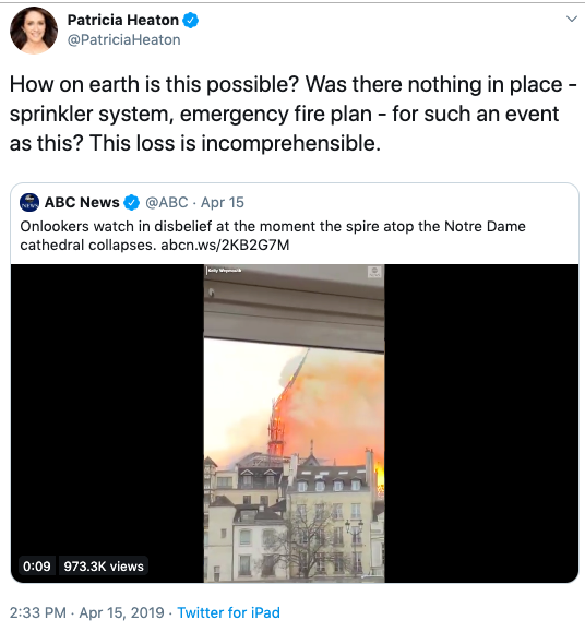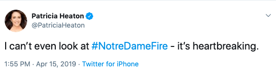 Actress Patricia Heaton tweeted, “I can’t even look at #NotreDameFire – it’s heartbreaking.”