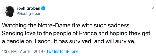 In this tweet he said, “Watching the Notre-Dame fire with such sadness. Sending love to the people of France and hoping they get a handle on it soon. It has survived, and will survive.”