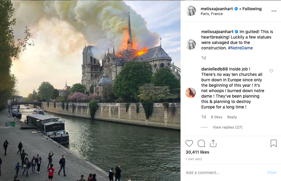 Actress Melissa Joan Hart posted her reaction, saying, “Im gutted! This is heartbreaking! Luckily a few statues were salvaged due to the construction. #NotreDame”