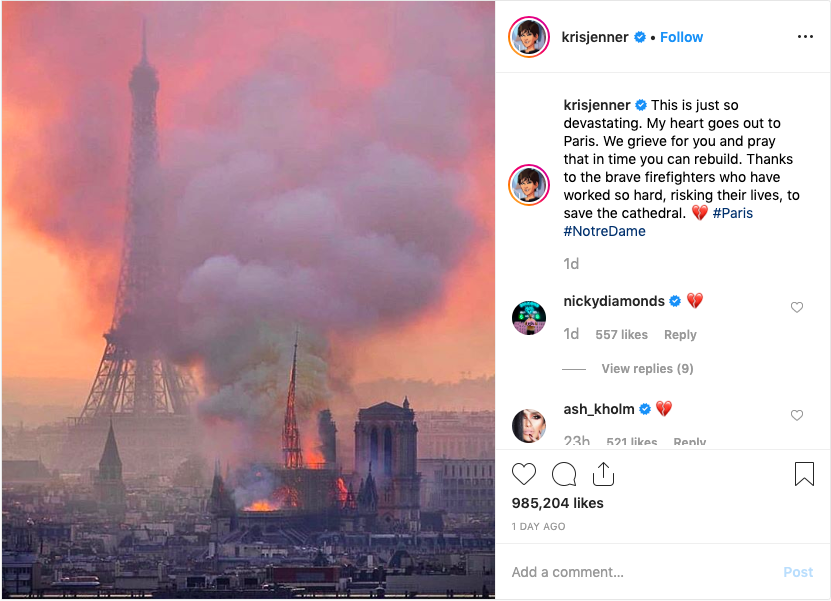Television personality Kris Jenner said in an Instagram post, “This is just so devastating. My heart goes out to Paris. We grieve for you and pray that in time you can rebuild. Thanks to the brave firefighters who have worked so hard, risking their lives, to save the cathedral. 💔 #Paris #NotreDame”
