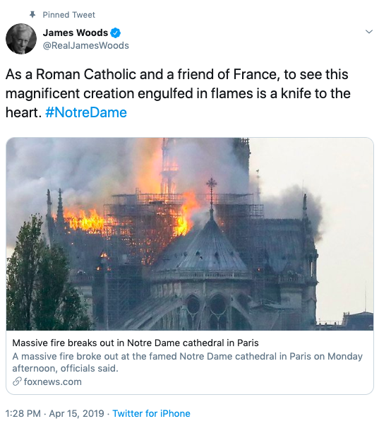 He said, “As a Roman Catholic and a friend of France, to see this magnificent creation engulfed in flames is a knife to the heart. #NotreDame”