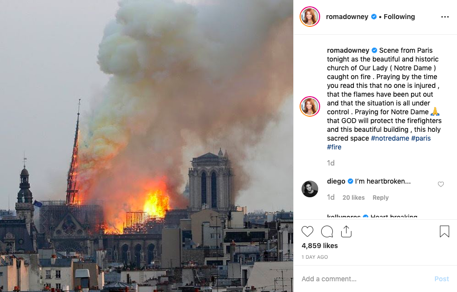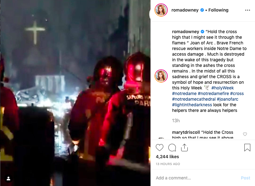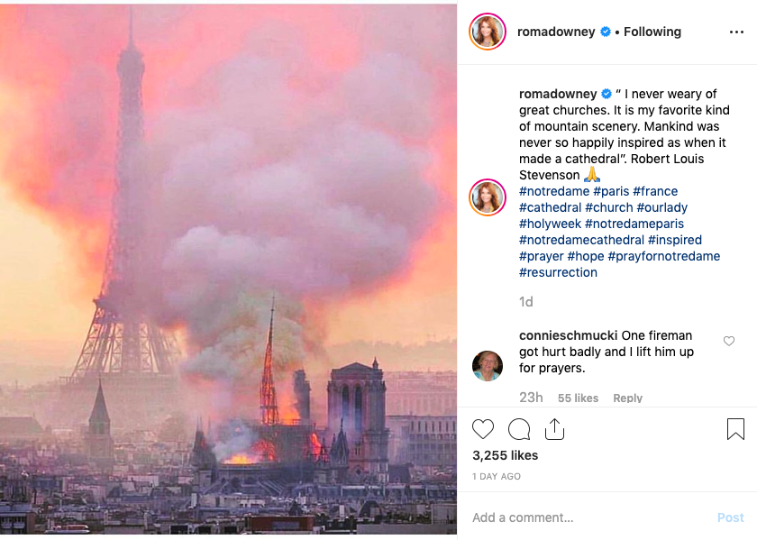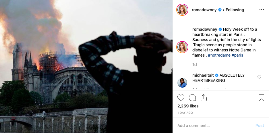 She posted a second photo which reads, “Holy Week off to a heartbreaking start in Paris. Sadness and grief in the city of lights .Tragic scene as people stood in disbelief to witness Notre Dame in flames . #notredame #paris.”