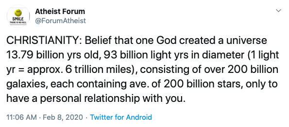 The full post reads, “CHRISTIANITY: Belief that one God created a universe 13.79 billion yrs old, 93 billion light yrs in diameter (1 light yr = approx. 6 trillion miles), consisting of over 200 billion galaxies, each containing ave. of 200 billion stars, only to have a personal relationship with you.”