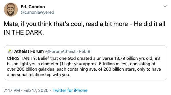 Canon Lawyer and Catholic News Agency D.C. bureau chief Ed Condon responded, “Mate, if you think that’s cool, read a bit more – He did it all IN THE DARK.”