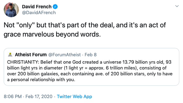 The Dispatch senior editor David French also responded, “Not ‘only’ but that’s part of the deal, and it’s an act of grace marvelous beyond words.”