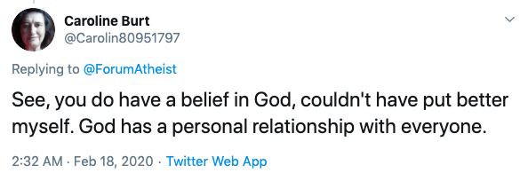 Catholic convert Caroline Burt said, “See, you do have a belief in God, couldn’t have put better myself. God has a personal relationship with everyone.”