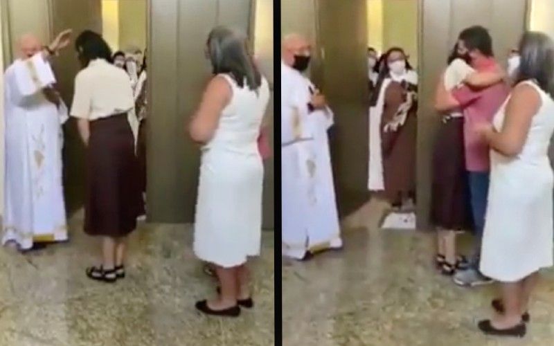 The video first depicts the convent doors opening as the woman receives a blessing.