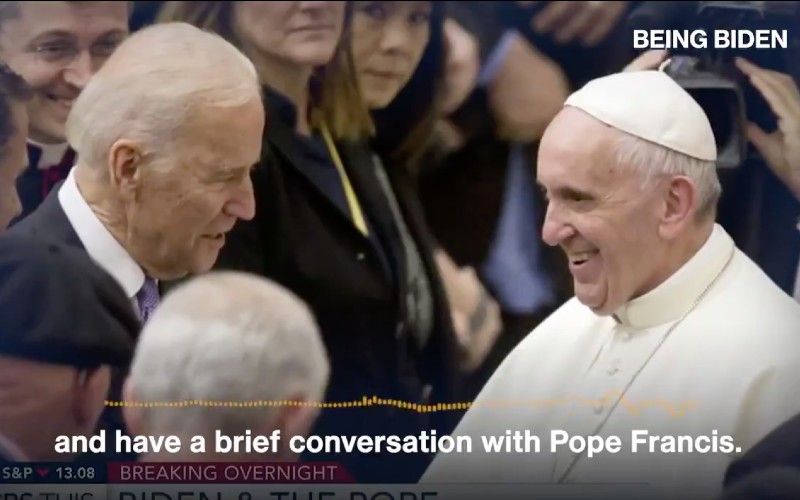 Biden narrates the video showing his past meeting with Pope Francis. He explains how being baptized and raised Catholic, as well as his Catholic education, helps him understand the importance of being”our brother’s keeper.”