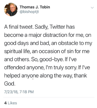 The text reads: “A final tweet. Sadly, Twitter has become a major distraction for me, on good days and bad, an obstacle to my spiritual life, an occasion of sin for me and others. So, good-bye. If I’ve offended anyone, I’m truly sorry. If I’ve helped anyone along the way, thank God.”