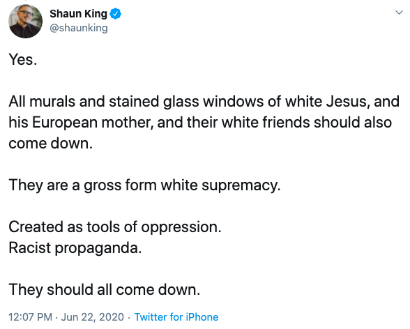 King continues in another tweet, saying, “Yes. / All murals and stained-glass windows of white Jesus, and his European mother, and their white friends should also come down. / They are a gross form white supremacy. / Created as tools of oppression. / Racist propaganda. / They should all come down.”