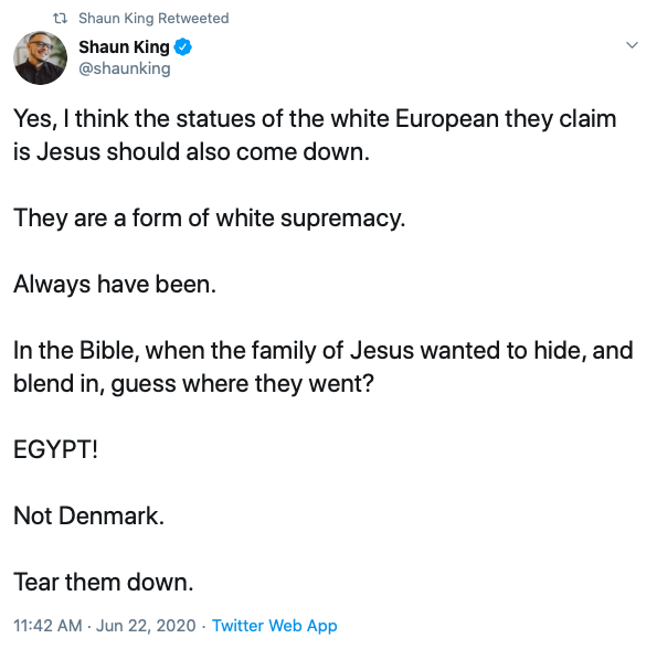 King’s first tweet reads, “Yes, I think the statues of the white European they claim is Jesus should also come down. / They are a form of white supremacy. / Always have been. / In the Bible, when the family of Jesus wanted to hide, and blend in, guess where they went? / EGYPT! / Not Denmark. / Tear them down.”