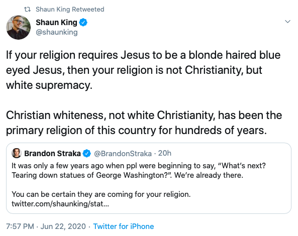A third tweet reads, “If your religion requires Jesus to be a blonde-haired, blue-eyed Jesus, then your religion is not Christianity, but white supremacy. / Christian whiteness, not white Christianity, has been the primary religion of this country for hundreds of years.”