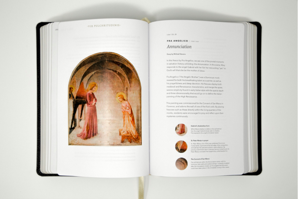 The Bible includes essays and meditations from various Church Fathers, artists, saints, and Catholic writers, including Bishop Robert Barron, Michael Stevens, Abp. Fulton Sheen, G.K. Chesterton, St. Augustine, St. Therese of Lisieux, St. John Chrysostom and many more.
