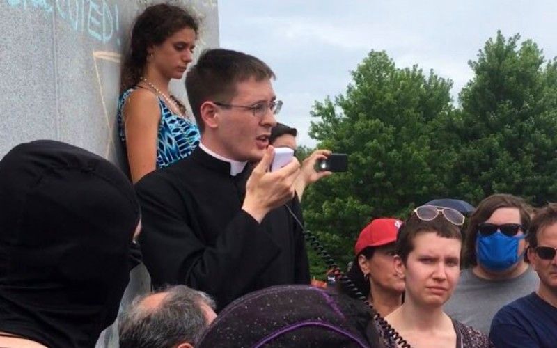 Fr. Stephen Schumacher of the Archdiocese of St. Louis defended the historic St. Louis statue in Mo. against a Black Lives Matter demolition protest.
