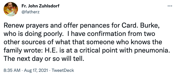 Fr. John Zuhlsdorf tweeted, “Renew prayers and offer penances for Card. Burke, who is doing poorly. I have confirmation from two other sources of what that someone who knows the family wrote: H.E. is at a critical point with pneumonia. The next day or so will tell.”