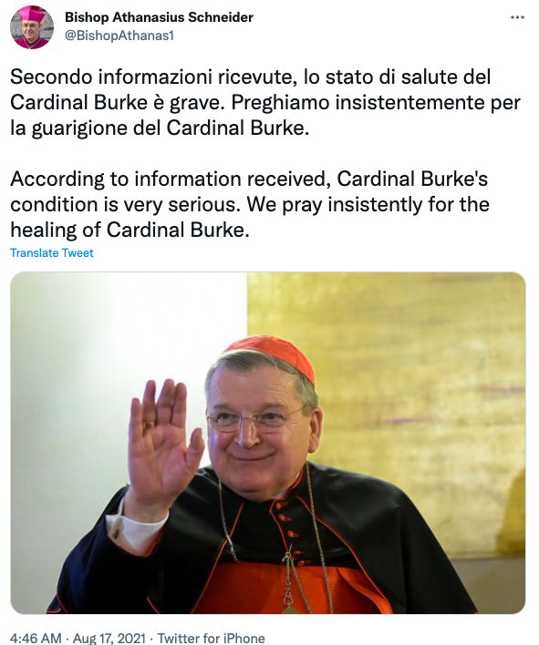 Bishop Athanasius Schneider of Astana, Kazakhstan also tweeted, “According to information received, Cardinal Burke’s condition is very serious. We pray insistently for the healing of Cardinal Burke.”