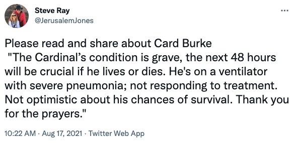 Catholic apologist Steve Ray wrote, “Please read and share about [Cardinal] Burke: ‘The Cardinal’s condition is grave, the next 48 hours will be crucial if he lives or dies. He’s on a ventilator with severe pneumonia; not responding to treatment. Not optimistic about his chances of survival. Thank you for the prayers.'”