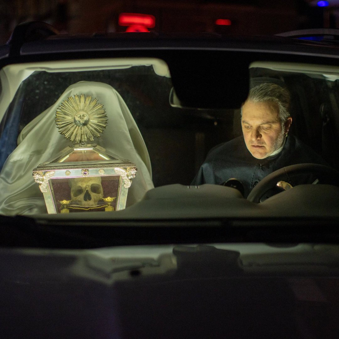 The photo taken by EWTN News photographer Daniel Ibañez depicts the reliquary in the passenger seat of a Jeep upon its transport to the Fossanova Abbey.