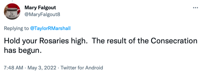 Referring to Pope Francis’ March 25 consecration to the Immaculate Heart of Mary, this user said, “Hold your Rosaries high. The result of the Consecration has begun.”