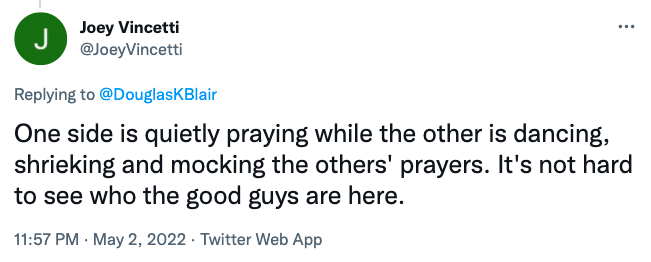 One user also said, “One side is quietly praying while the other is dancing, shrieking and mocking the others’ prayers. It’s not hard to see who the good guys are here.”