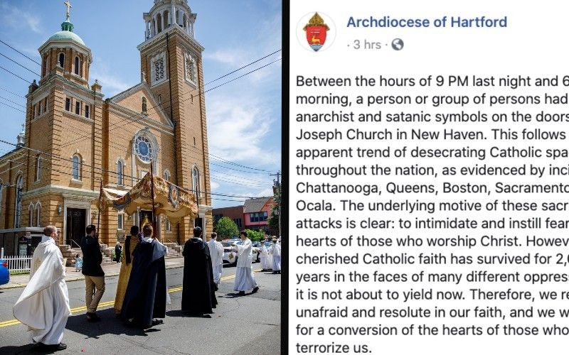 “Between the hours of 9 pm last night and 6 pm this morning, a person or group of persons had painted anarchist and satanic symbols on the doors of St. Joseph Church in New Haven.