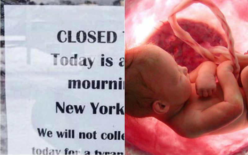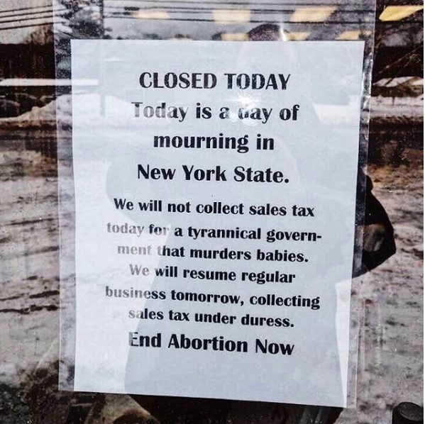 The sign reads, “CLOSED TODAY. / Today is a is a day of mourning in New York State. / We will not collect sales tax today for a tyrannical government that murders babies. / We will resume regular business tomorrow, collecting sales tax under duress. / End Abortion Now”.