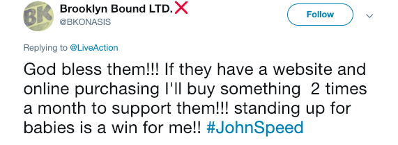 Another user said, “God bless them!!! If they have a website and online purchasing I’ll buy something 2 times a month to support them!!! standing up for babies is a win for me!! #JohnSpeed”.